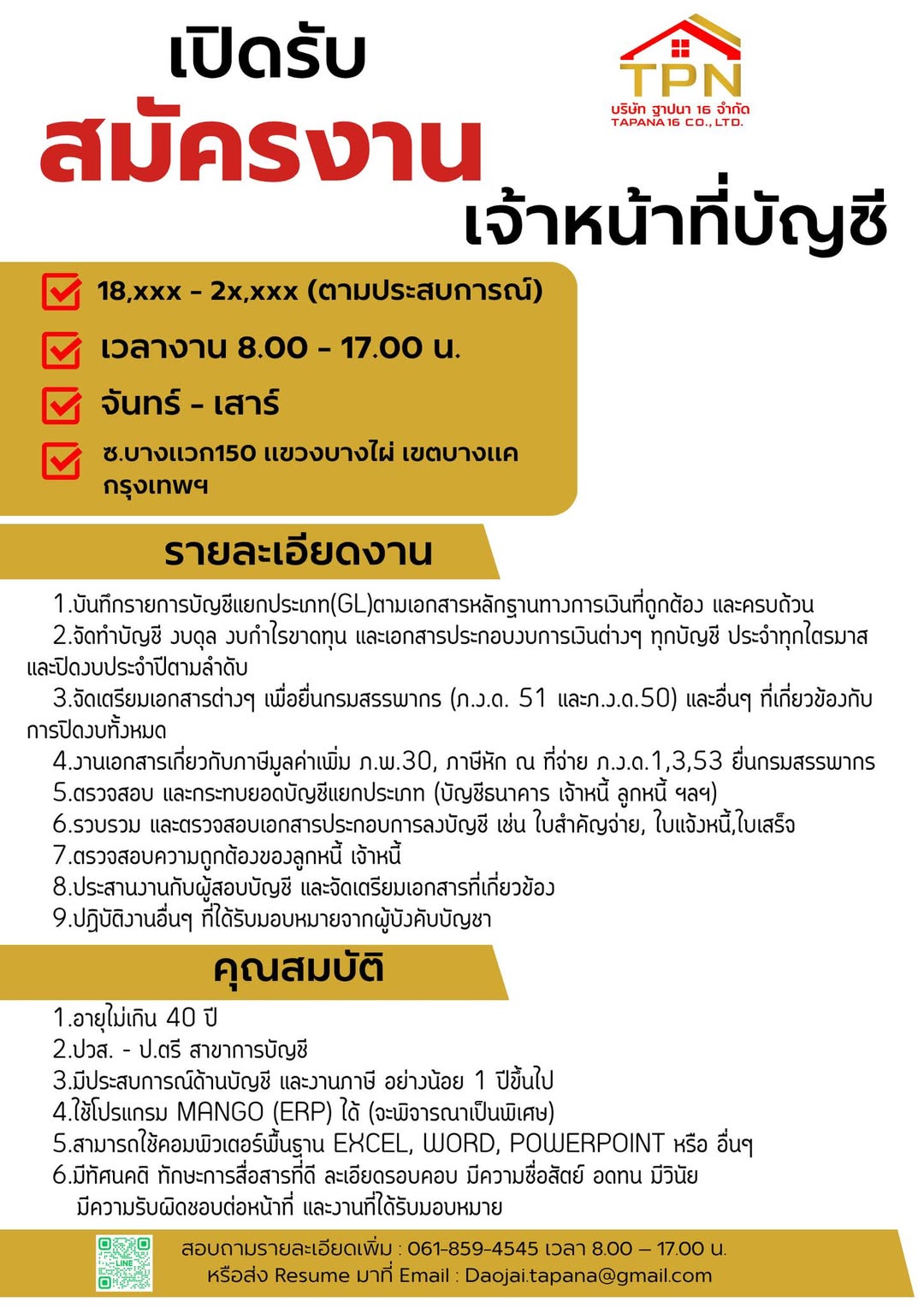 รับสมัครงาน ตำแหน่งเจ้าหน้าที่บัญชี 1 ตำแหน่ง